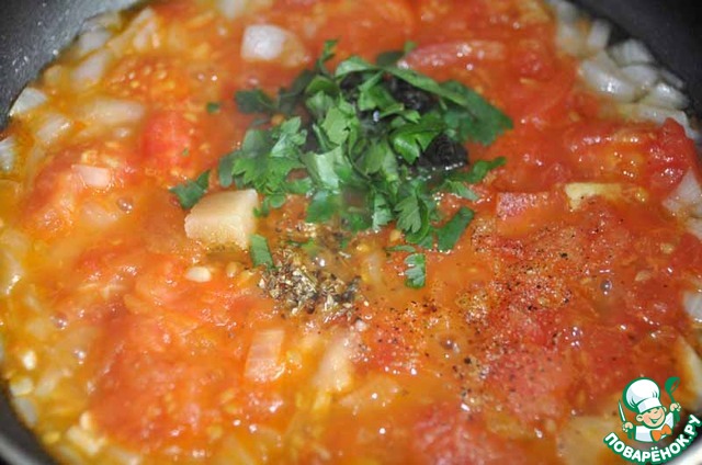 Добавляем соль, сахар, чёрный молотый перец, сушёный орегано, мелкопорубленную зелень петрушки и базилика.