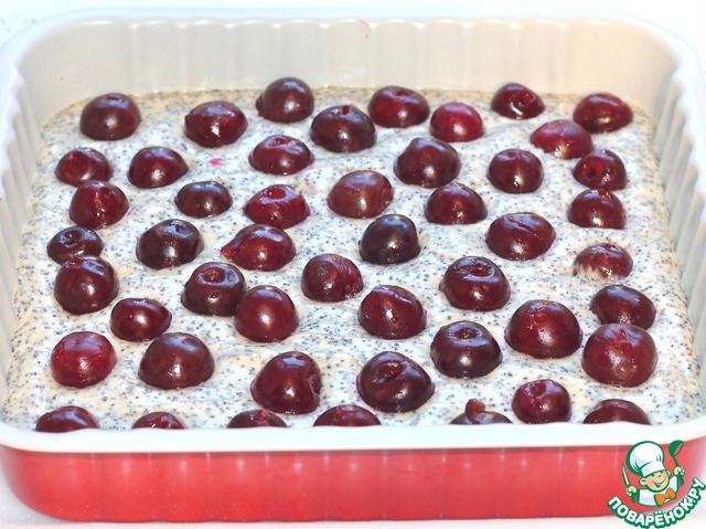 Сверху выложите вишню и отправляйте противень в разогретую до 180 С духовку на 30-40 минут. Готовность проверяйте острой, деревянной палочкой.