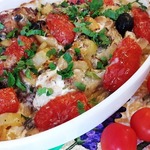 Тушеные овощи откинуть в тарелку с помощью шумовки или специальной ложки с дырочками, чтобы не попадало масло. Распределить поверх курицы и кабачков, посолить и поперчить, равномерно посыпать орегано, каперсами, маслинами и петрушкой. Залить сливками. Закрыть плотно фольгой и запекать в прогретой до 200"С духовке 30-35 минут. Ориентируйтесь на вашу духовку!