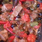 В том же масле 2-3 минуты тушим нарезанный лук и чеснок, добавить целые помидоры и перец (нарезанный крупными кусками), тушить еще 2-5 минуты.