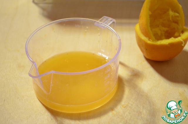 2. Из апельсина отжать сок, снять цедру. Сок смешать с цедрой, добавить 1 чайную ложку сахара.