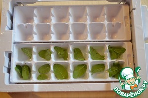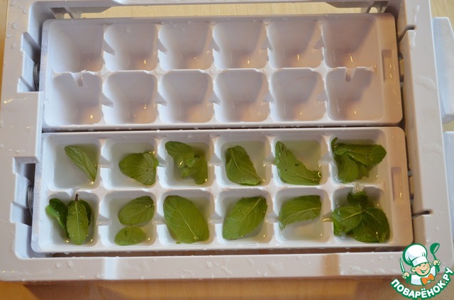 4. Мяту разобрать на листочки выложить в форму для льда, залить водой с добавлением сахара (на 50 мл 1 чайную ложку) и несколько капель ванильной эссенции. Фруктовый лед я замораживала с вечера. В обед я достала лед из формы, выложила в большой стакан и залила минеральной водой, так чтоб лед был полностью покрыт. Получился очень освежающий напиток!