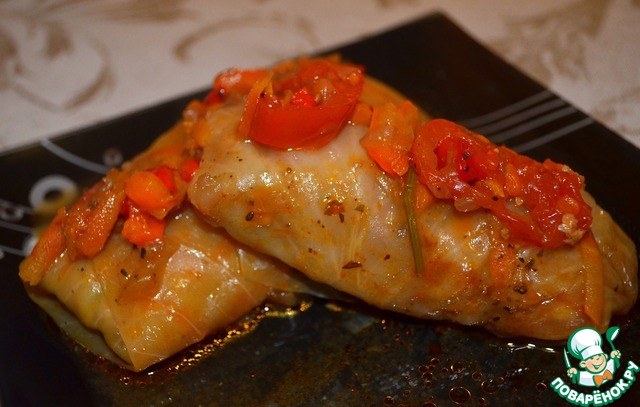 Это, скорее всего, способ формовки голубцов, которые готовятся из летних сортов капусты, потому что листья ее более нежные и мягкие. Да и, вообще, благодаря молодой моркови и зелени, а также спелым и ароматным помидорам блюдо получается очень вкусным, ярким и насыщенным.