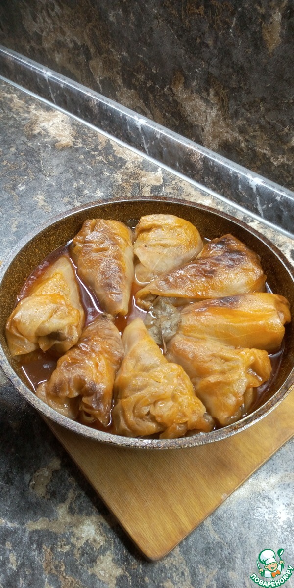 Залить соусом голубцы. Форму плотно закрыть фольгой и поместить в прогретую до 190"С духовку на 30-40 минут. Ориентируйтесь на вашу духовку!