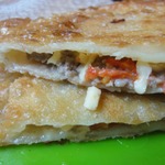 Положить на тесто столовую ложку фарша и размазать его на половине лепешки.