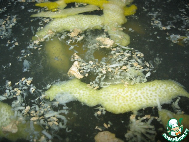 В тёплой воде растворить стакан сахара, добавить сухие дрожжи и смесь лимонного сока, цедры и имбиря.