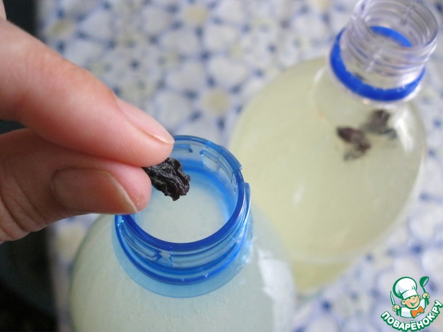 Процедить, разлить по бутылкам, в каждую положить по 7-10 изюминок (не мыть). Бутылки плотно завинтить крышками и оставить еще на 1,5-2 дня.