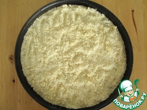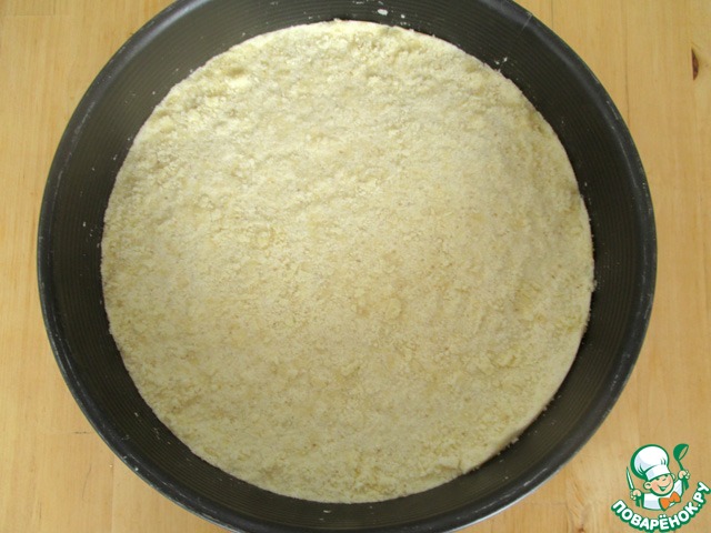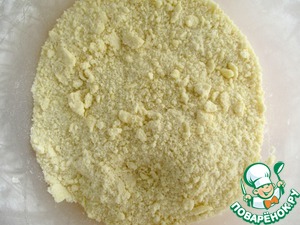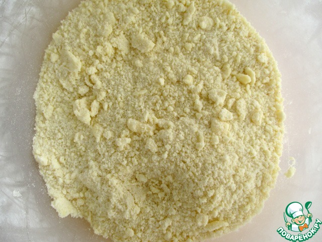 Муку (400 гр) смешать с сахаром (200 гр) и ванильным сахаром (11 гр). Добавить холодное сливочное масло (230 гр), нарезанное кубиками. Руками все перетереть в мелкую крошку. -