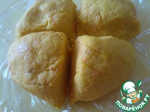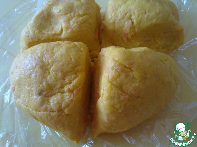 Всё перемешать. Замесить тесто. Скатать его в шар, обернуть пищевой плёнкой и положить в холодильник на 20-30 минут.