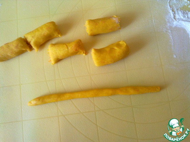 Из одной части теста раскатываем колбаску. Делим колбаску на 6 равных частей. Затем каждую раскатываем в виде палочки.