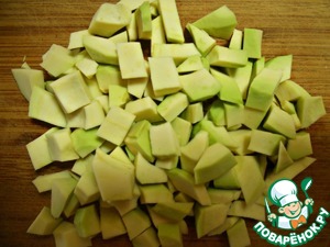 Авокадо очистите от жесткой кожуры и удалите косточку, нарежьте небольшими кубиками.