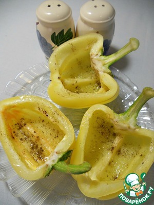 Смажьте чашечки перца оливковым маслом, слегка посолите и поперчите их.