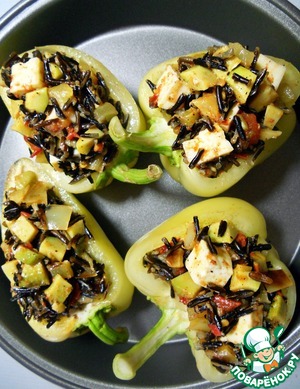 Смешайте тушеные овощи с сыром и рисом. Нафаршируйте смесью половинки перца.