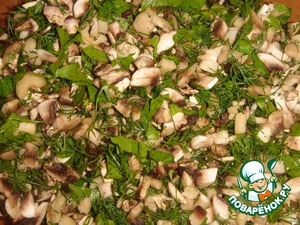Грибы мелко порезать, добавить рубленную зелень, слегка присолить и поперчить.