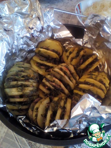Начиненную картошку выложить на противень (я застелила его фольгой) и слегка полить маслом. В рецепте давалось сливочное мало, но я предпочитаю растительное, поэтому слегка сбрызнула оливковым.