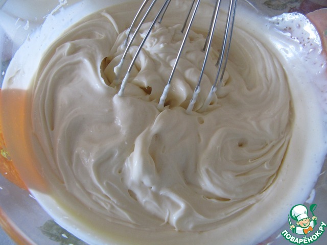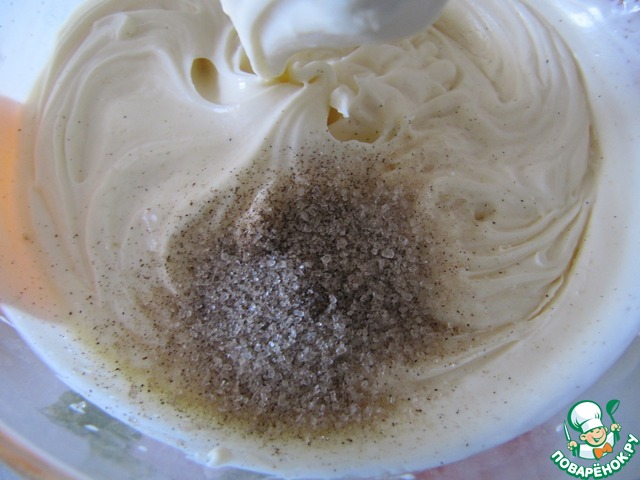 • Сливки взбить с сахаром (1/4 стакана) в густой пышный крем