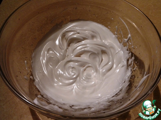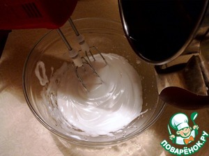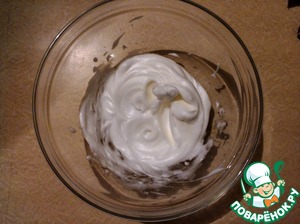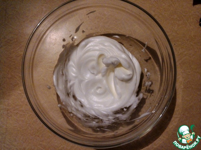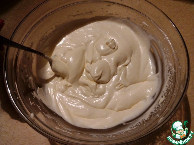 • Смешайте сливочный и белковый крем, вводя второй по 1 ложке. Мешайте снизу вверх.