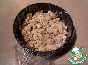 Выход: 3 листа бумаги для принтера режу вдоль и вкладываю между пищевой пленкой и формой, тем самым увеличиваю высоту, для надежности зафиксировала по периметру ниткой для вязания.