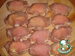 Эту конструкцию оберните кусочком отбитого мяса и заколите зубочистками. Получается мешочек или конвертик.