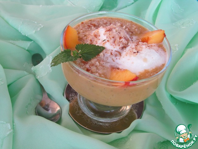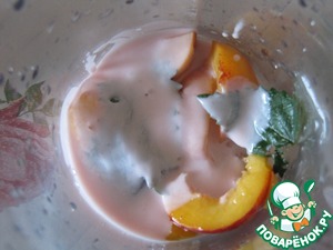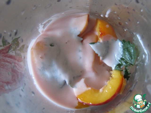 Добавить 2-3 шарика пломбира, украсить дольками нектаринов, листочками мяты и сразу подавать.