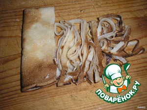 Я пеку блинчики чуть соленые. Блинчики свернуть уголком и нарезать ленточками, вот так:
