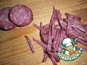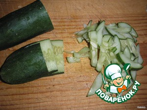 Добавить колбасу, огурчик, блинчики, все перемешать и чуть подсолить.