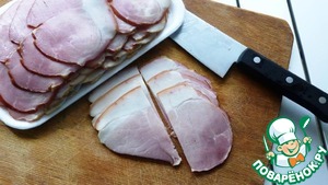 Бекон порезать на 2 части. Если будете использовать с/к бекон, его лучше порезать на 3 - 4 части поперек. Примерно так, чтобы 1 кусочек приходился на порцию.
