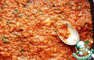 Разогреваем масло в сковороде и выкладываем измельченные овощи. Обжариваем мин 5. Добавляем чеснок и измельченную мякоть помидоров (у меня покупная). Тушим под крышкой мин 10.