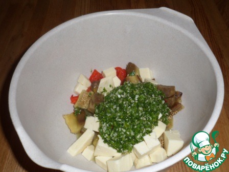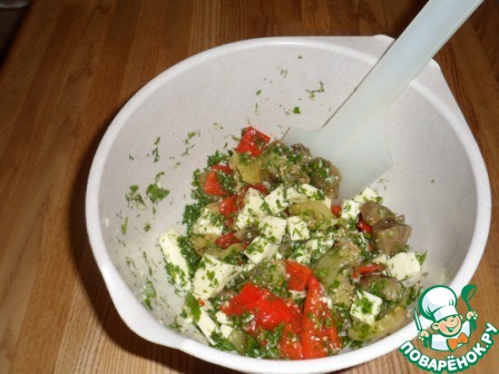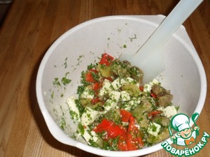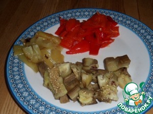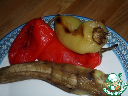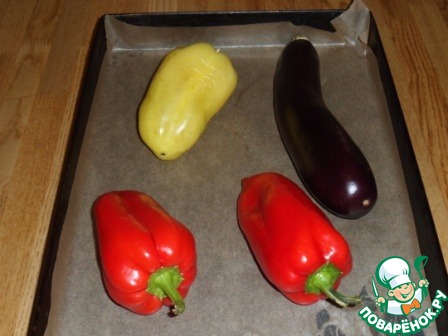 Перцы и баклажаны выложить на противень, застеленный пергаментной бумагой. Запечь в духовке, переворачивая по надобности.