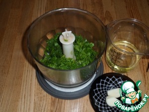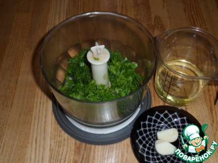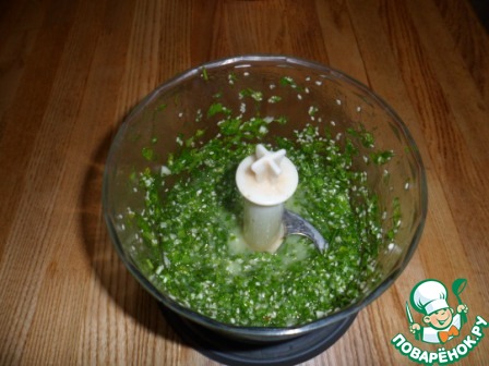 Порезанные укроп и петрушку, вместе с кунжутом и чесноком сложить в блендер. Добавить масло и соль, а также сок из перцев. Перебить в блендере, но не до однородности, не много, чтобы сохранить цвет.