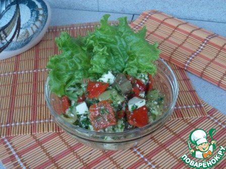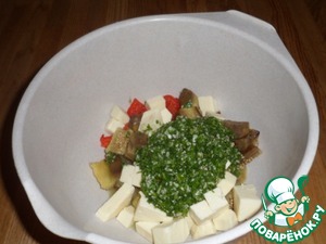 Сложить овощи и сыр в глубокую посуду, добавить соус.
