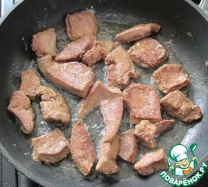 Печень вымыть. Очистить от пленки, вырезать все желчные протоки, промыть. Осушить салфеткой, слегка отбить. Порезать небольшими кусками, посолить и поперчить. Обжарить на разогретом растительном масле с двух сторон (2-3 минуты).