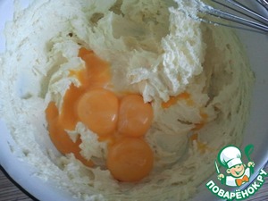 Добавляем 4 желтка (белки в это время охлаждаются в холодильнике) и взбиваем. Я использовала миксер, скорость средняя.