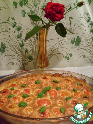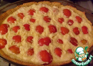 Заливаем полученной смесью помидоры и отправляем наш пирог в духовку, разогретую до 180 градусов.