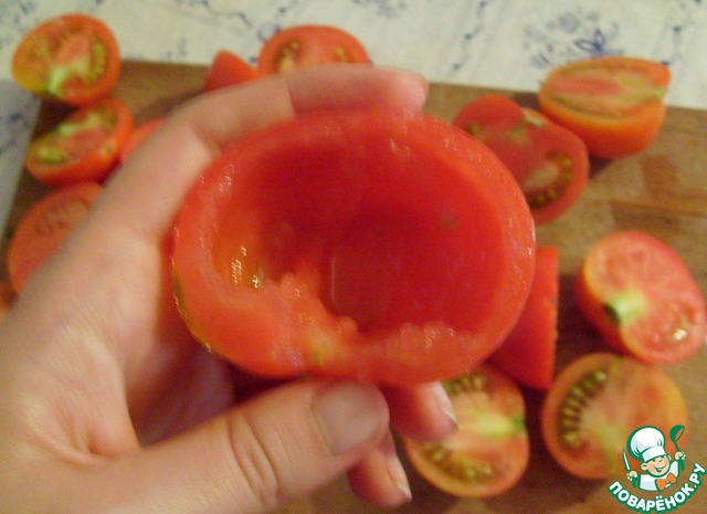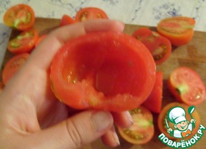 Пока наше тесто прекрасно проводит время в духовке, мы разрежем помидорки пополам и чайной ложечкой удалим семена. Должны получиться вот такие чашечки.