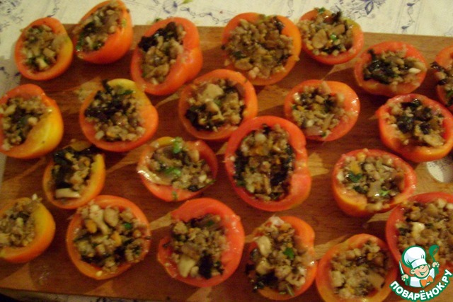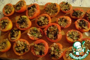 Достаем основу из духовки и складываем в нее наши помидорные чашечки срезом вниз.