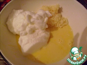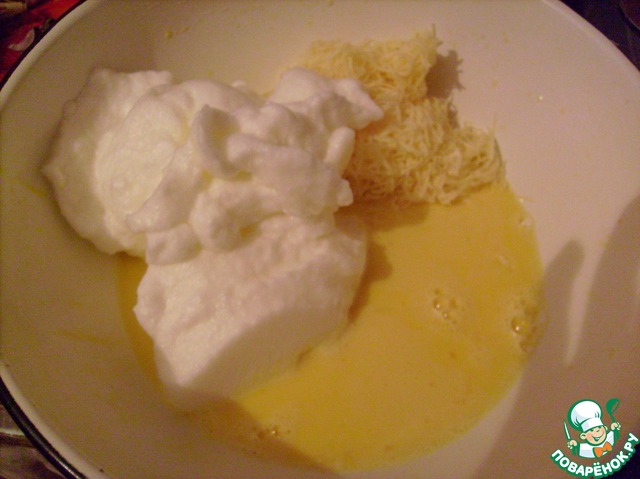 Готовим заливку. Желтки 2 яиц отделяем от белков и смешиваем их со сливками. Сыр натираем на мелкой терке и отправляем туда же. Белки взбиваем в крепкую пену и аккуратно подмешиваем к основной массе.