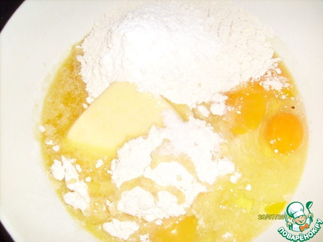 Начнем мы наше творение из приготовления теста, которое замесим из масла, муки, желтков и разрыхлителя.