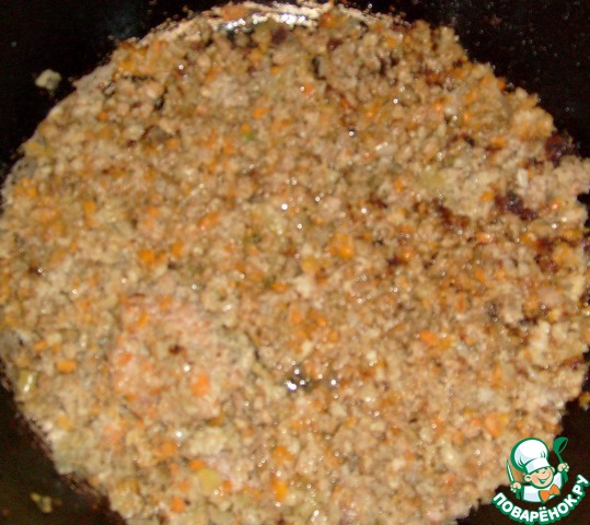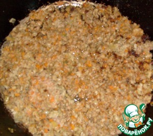 Пока наше тесто охлаждается, мы обжарим фарш с луком и морковкой, а так же отдельно отправим на сковородку нарезанные меленько грибочки с лучком. Обжарим до готовности, посолим и поперчим по вкусу.