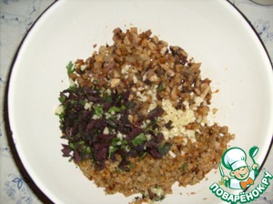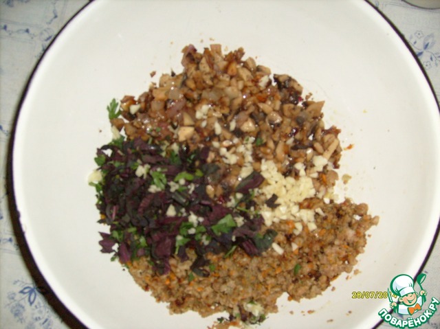 Смешаем обжаренные фарш и грибы, добавим зелень, мелко нарезанные чеснок и болгарский перец.