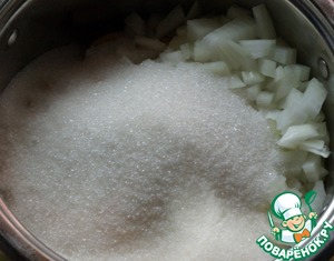 Добавляем нарезанный мелким кубиком репчатый лук и засыпаем сахаром.