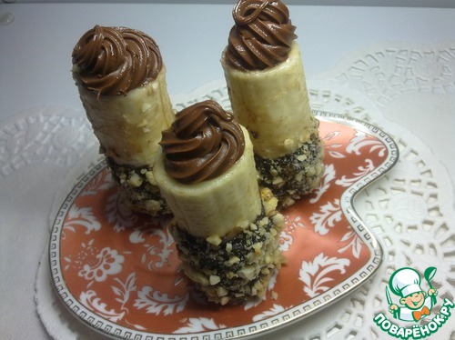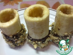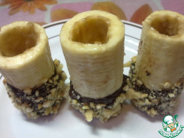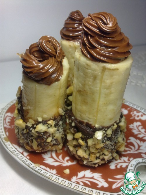 Низ бананов обмакиваем в шоколад, а затем обсыпаем орешками. На несколько минут ставим десерт в холодильник, чтобы застыл шоколад.