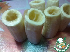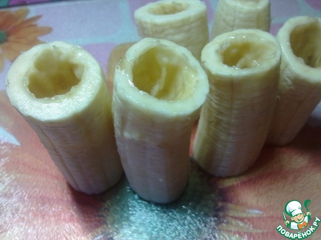 Бананы очищаем от кожуры и каждый разрезаем на 3 части. Аккуратно извлекаем середину, можно для этого использовать тонкий нож.