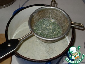 Мяту мелко нарезать. Нарезанную мяту выложить в чашу блендера, добавить 3 ст. л. настоявшихся сливок и взбить до пастообразного состояния.