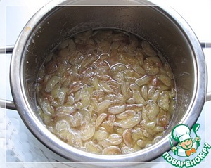 Через 20 минут половину грушевых долек вынуть из варенья и измельчить блендером или толкушкой. Вернуть пюре в варенье.