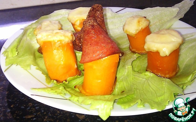 Предлагаю вам вариант горячей закуски из фаршированной морковки, запеченной в духовке.
