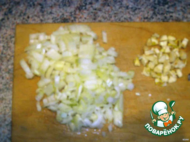 Брокколи чистим, моем, делим на небольшие соцветия, стебли режем кубиками. Лук и ченок чистим и тоже режем кубиками.