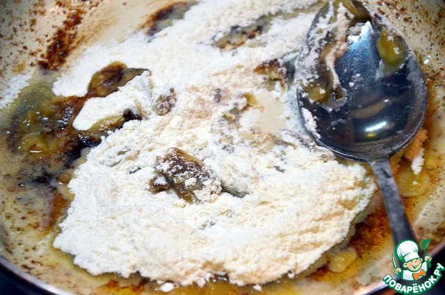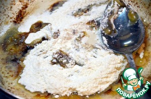 В жир, в котором жарились помидоры, добавить муку и обжарить пару минут, помешивая.
