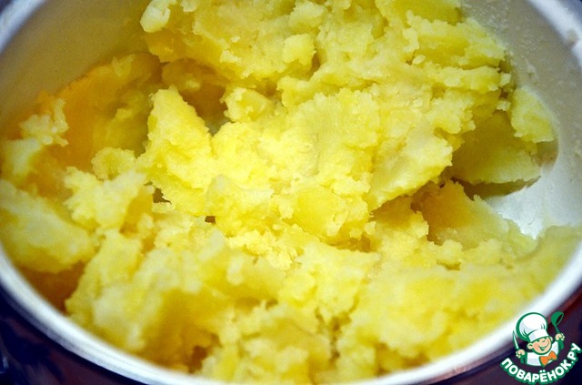 Отвариваем картофель в мундире. Сливаем и обсушиваем картофель. Очищаем и разминаем картофель толкушкой. Остужаем.