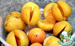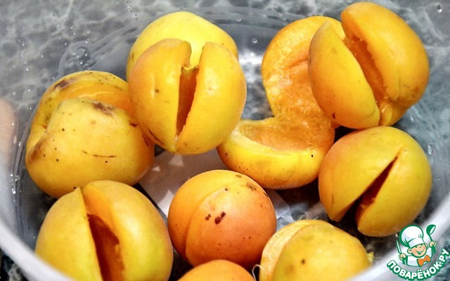 Промываем и обсушиваем абрикосы. Разрезаем пополам. Удаляем косточки.